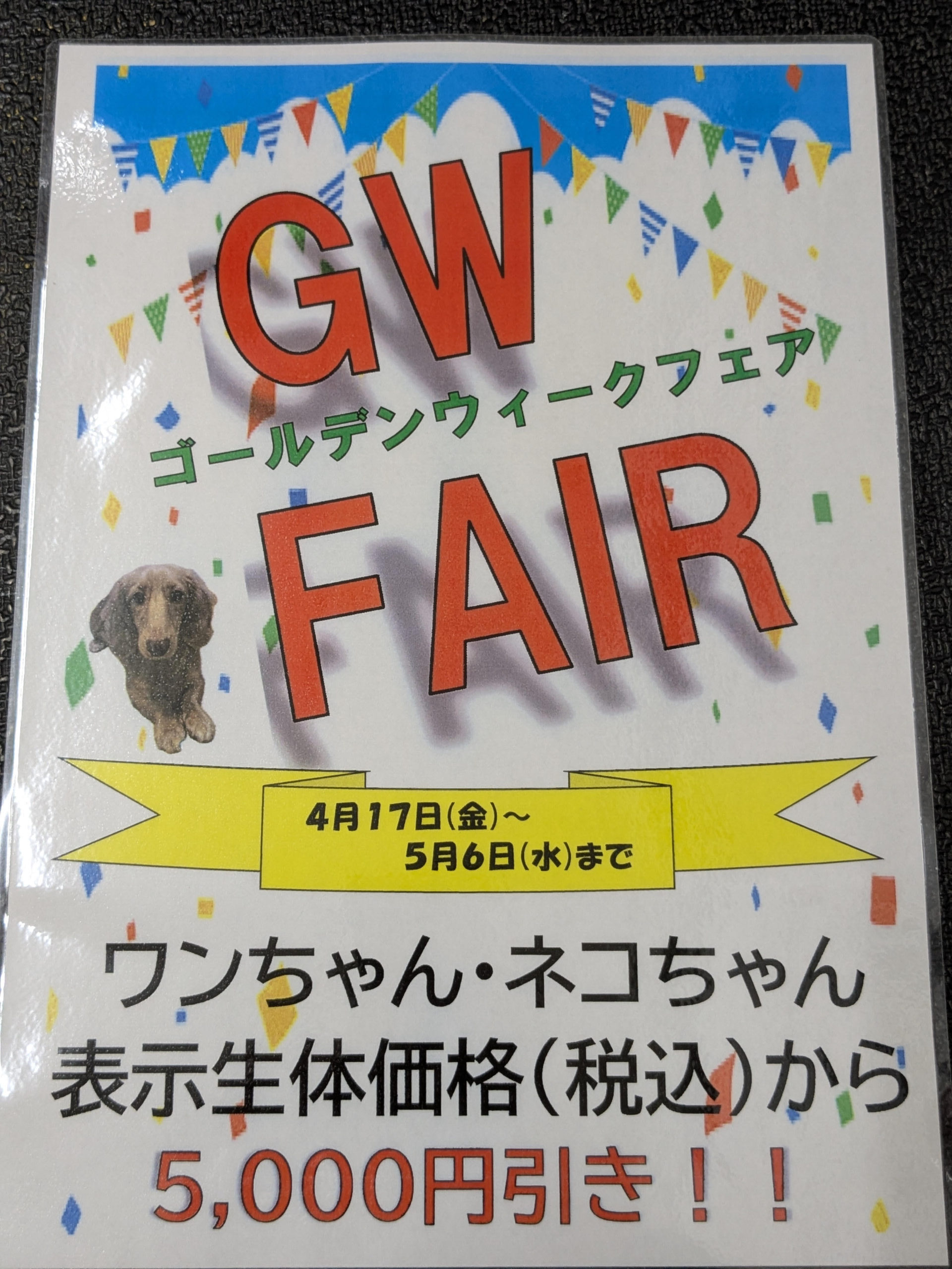 多賀城店ではGWということで4/17~5/6までにワンちゃん・ネコちゃんをお迎え頂くと表示生体価格(税込)から5,000円のお値引きをさせて頂きます!