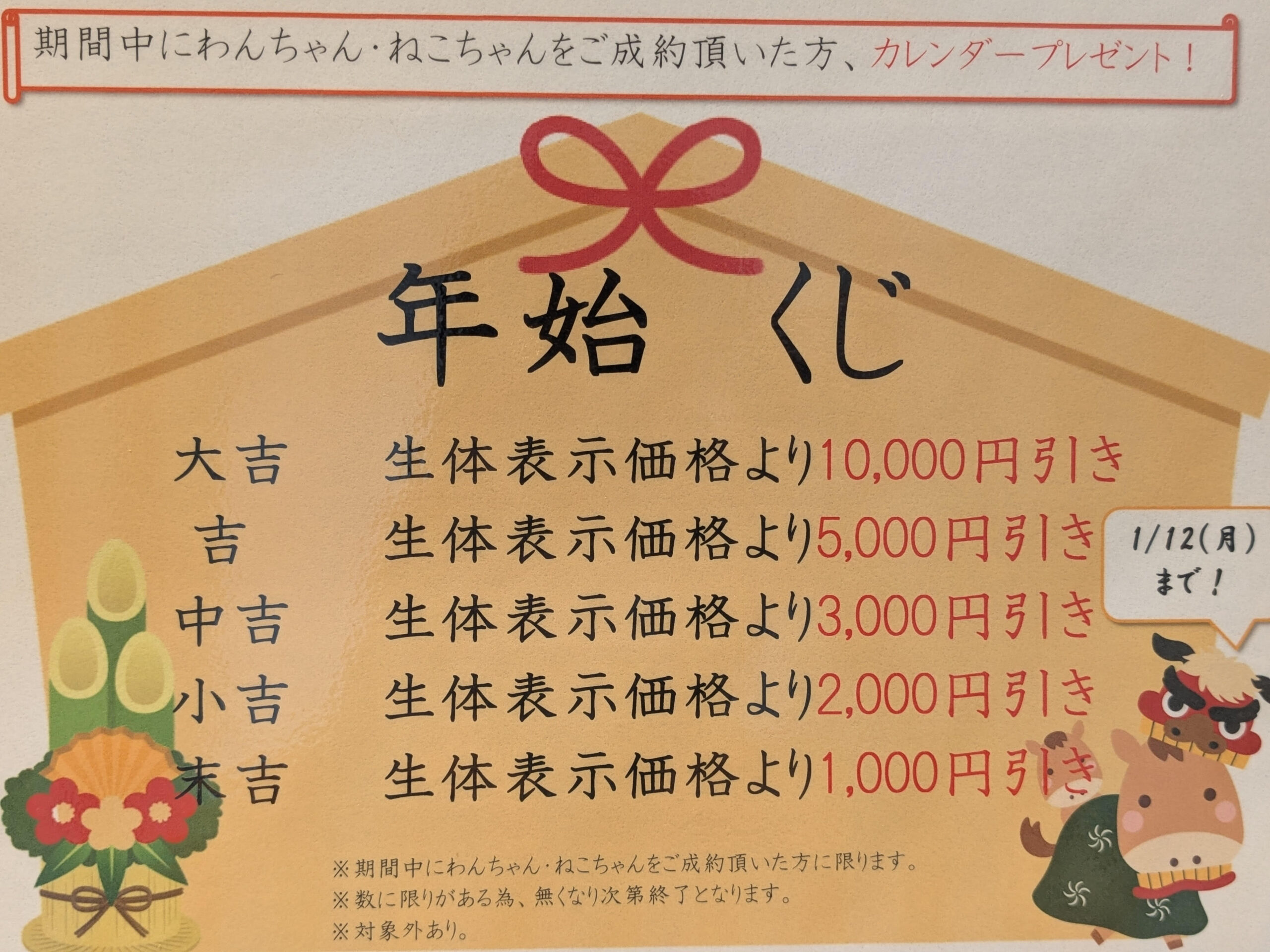多賀城店では2026年初めのお迎えキャンペーンといたしまして1/2~1/12までの間でご成約の方には年始くじをひいて頂きます!
